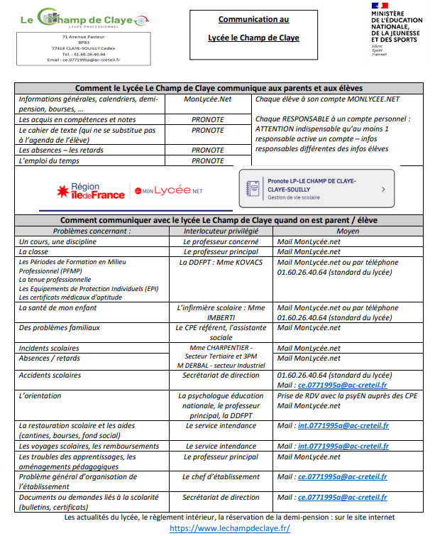 Vous trouverez ci-dessous le règlement intérieur du Lycée Professionnel Le Champ de Claye